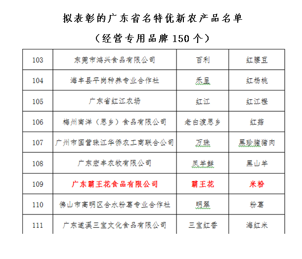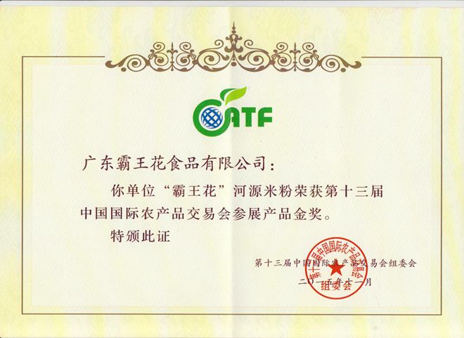 同月,由中国国际农产品交易会举办的第十三届中国国际农产品交易会“霸王花”米粉荣获参展产品金奖;与此同时,参加第四届惠州现代农业博览会被评为“最受欢迎产品”;并被河源市政府授予“农业标杆企业”。